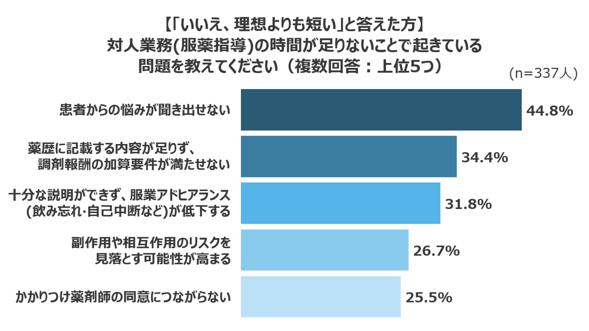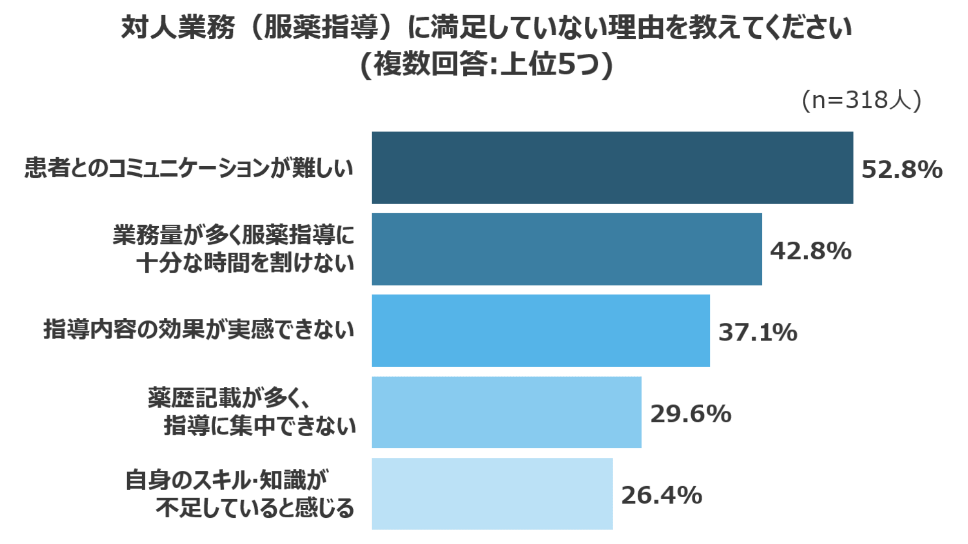 その主な理由は、グラフのとおりです。上位2項目には「患者とのコミュニケーションが難しい」と「業務量が多く服薬指導に十分な時間を割けない」が並びます。