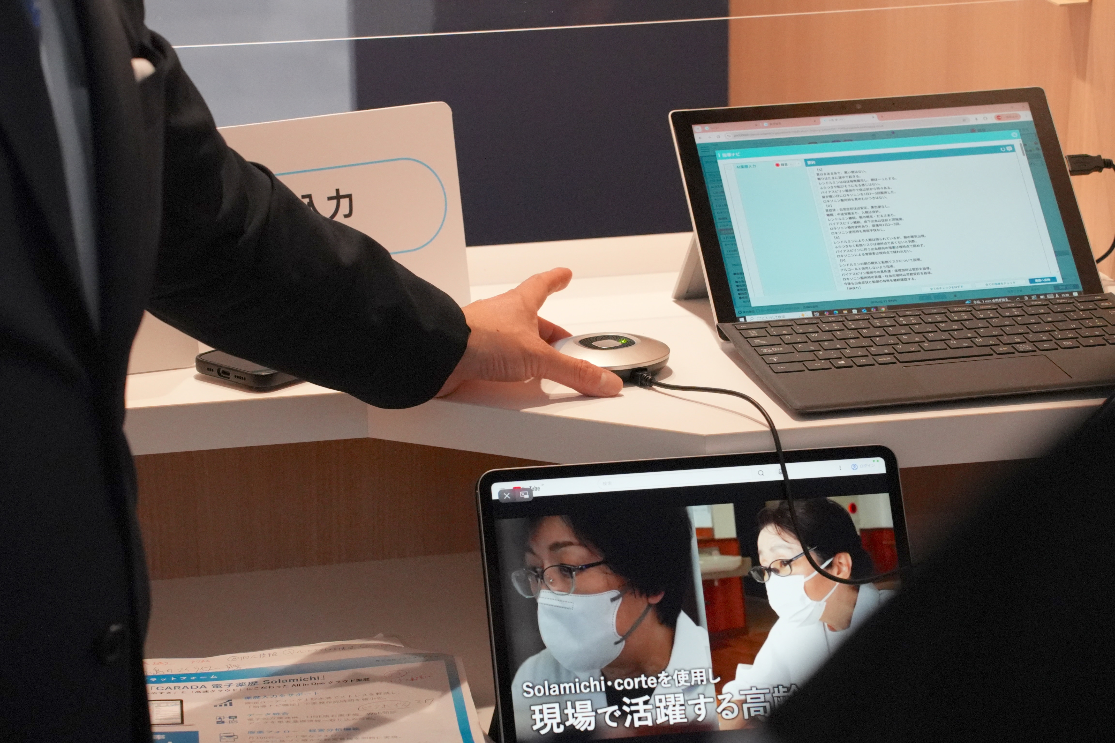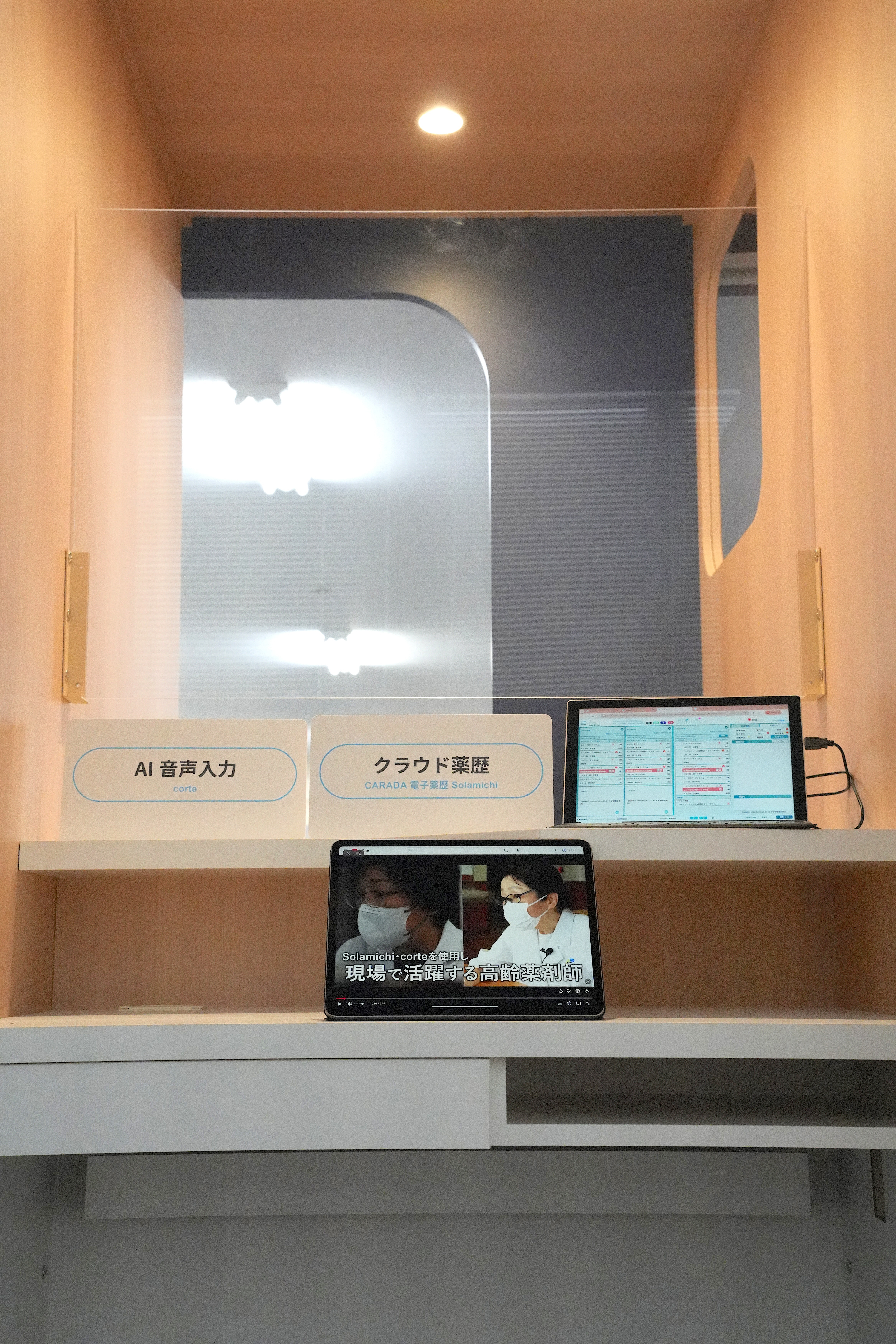 実際の投薬カウンターを模したブースで、AI音声入力や遠隔服薬指導など「次世代の薬局DX」をまるごとご体験いただき、
